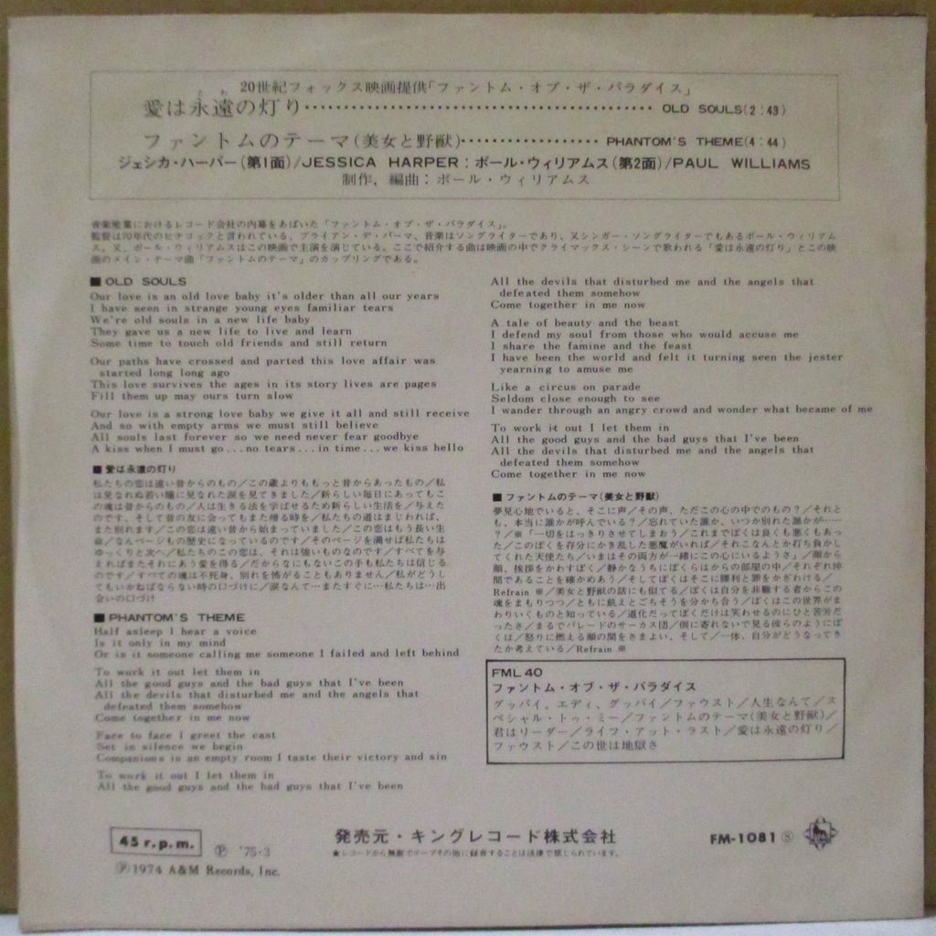 '74年公開映画「ファントム・オブ・パラダイス」挿入、「ジェシカ・ハーパー」「ポール・ウィリアムズ」による両面哀愁名曲バラッド。このカップリング・シングルは日本のみ!