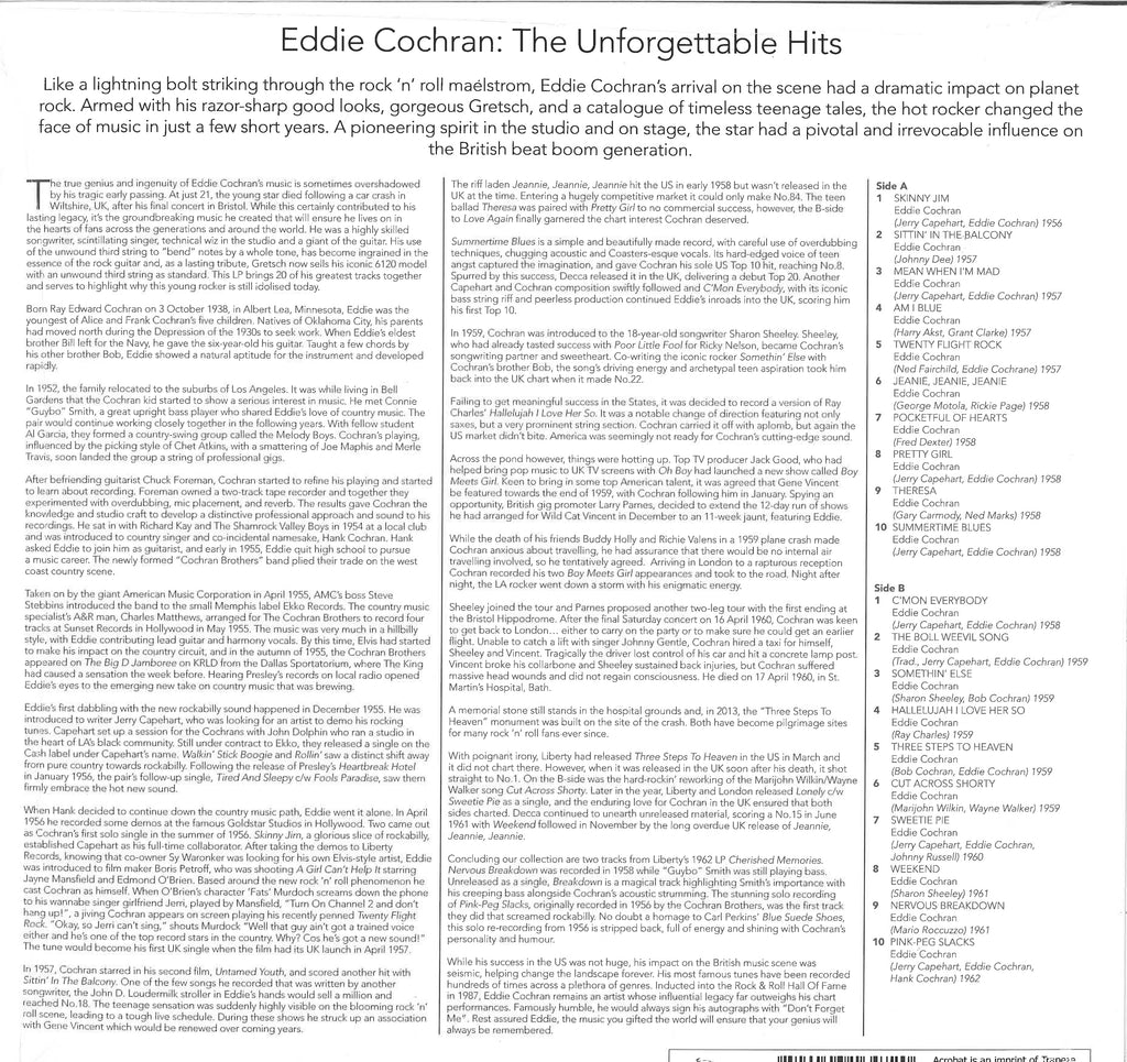 「カモン・エブリバディ」「サマータイム・ブルース」「サムシング・エルス」「バルコニーに座って」「ジニー・ジニー・ジニー」「20フライト・ロック」「スウィーティ・パイ」「ハレルヤ・アイラブ・ハー・ソー」「ピンク・ペッグ・スラックス」「ナーバス・ブレイクダウン」等、ロックンロール・クラシック満載の全20曲。