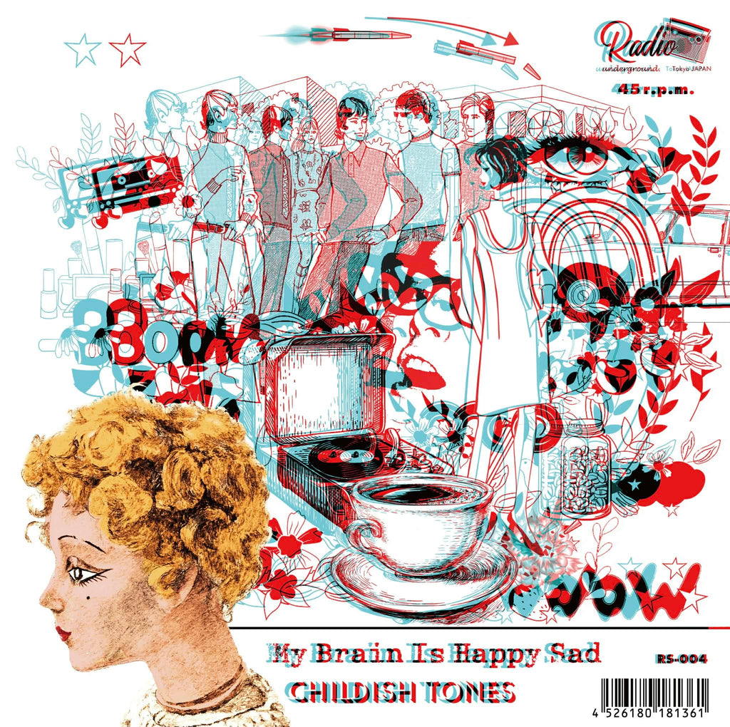 オモチャ楽器楽団チャイルディッシュ・トーンズ feat.宇佐蔵べに嬢の最新7インチは、APRIL MARCHのKILLERなフレンチ・ガレージ・ポップ「CHICK HABIT」の日本語カバーと、カップリングにはチップチューン・サウンドを取り入れたシューゲイズ・ガレージなオリジナル・ナンバー「MY BRAIN IS HAPPY SAD」を収録。 オールドスクールな3Dメガネ付きの飛び出すジャケット仕様! RADIO UNDERGROUNDより300枚限定リリース!