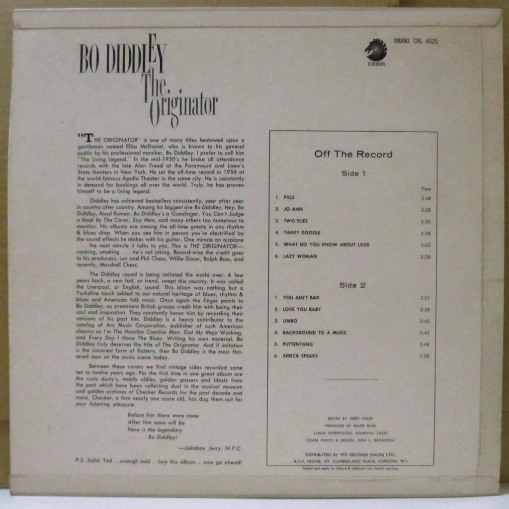 偉大なるR&Bロッカー「ボ・ディドリー」の'66年14作目アルバム。N.Y.ドールズのカバー原曲「Pills」、R&Bノーザン「Jo Ann」、ほっこりR&B「You Ain't Bad」などの'61〜'65年シングル曲や、いかついラテンR&B「Limbo」に、エギゾチックな「Africa Speaks」など、渋曲&粒ぞろいの全12曲!