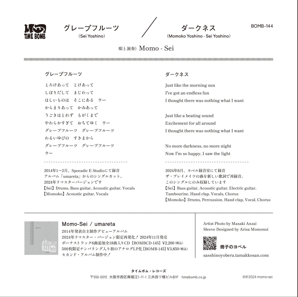 ザ・プレイメイツ、サニチャー、ジ・オートマチクスなどで活動していた「よしのせい&よしのももこ」によるソングライターズ・チーム、Momo-Sei '14年自主製作1st アルバム「umareta」の、10年ぶりリマスター再発記念先行限定7インチ!アルバム冒頭を飾る、ザ・プレイメイツ期の未発表極上美メロ・ポップ(&ロックンロール)!パワーポップファンどころか全音楽ファンに聴いて頂きたい思わず口ずさむ名曲です。B面はアルバム未収録で、このシングルのみで聴けるコレ又ザ・プレイメイツ期(ザ・バニーズのカヴァでも知られる)'97年名曲の別歌詞2024年録音新バージョン!こちらノーザンポップ好きにもドススメ!